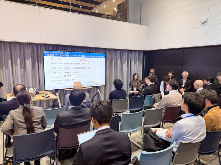 業界団体、企業、自治体の関係者が一堂に会し、プラスチック・紙おむつ・小型家電・リチウムイオン電池などの資源循環について議論する場として開催されました。定員を超える参加者が集まり、資源循環に対する関心の高さが示されました。